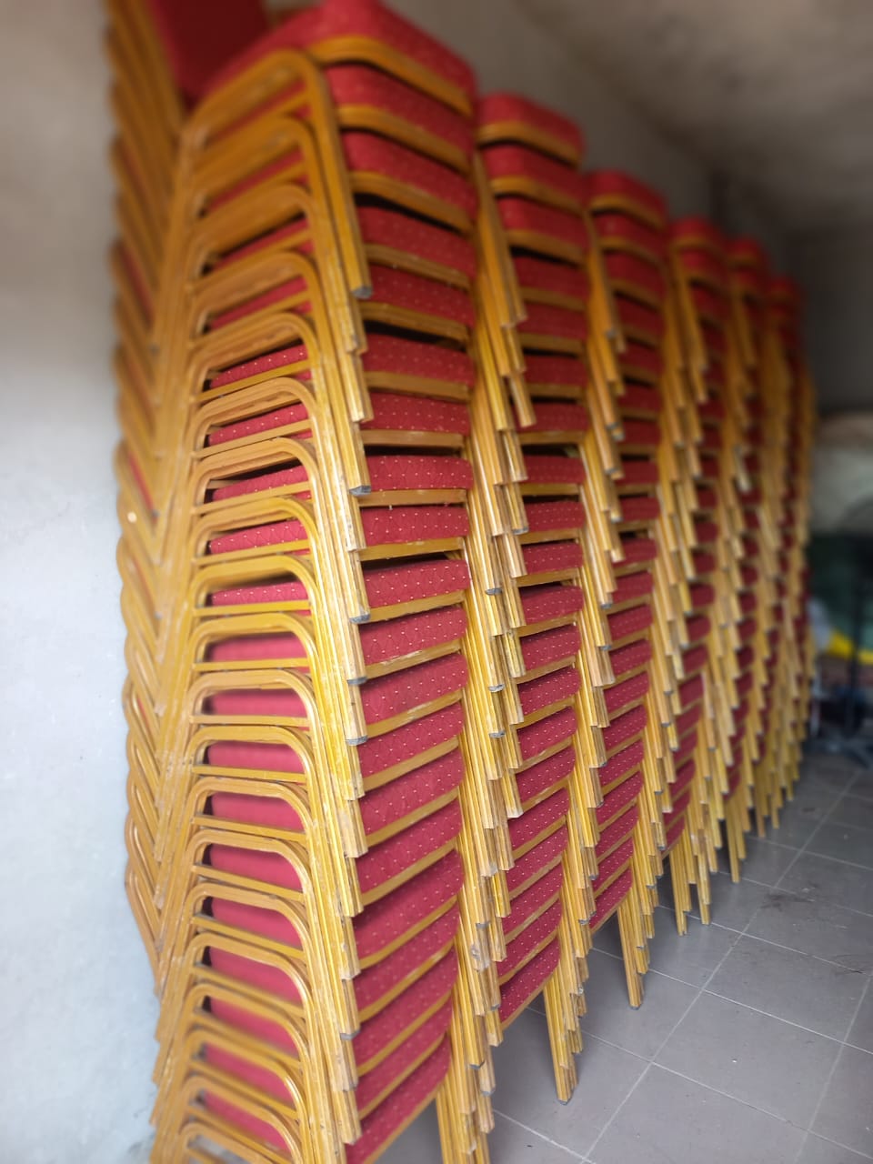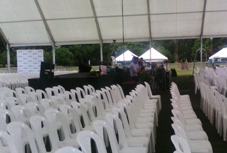 Chaises, bâches, vaisselle, toilettes publics, lumière, verres...